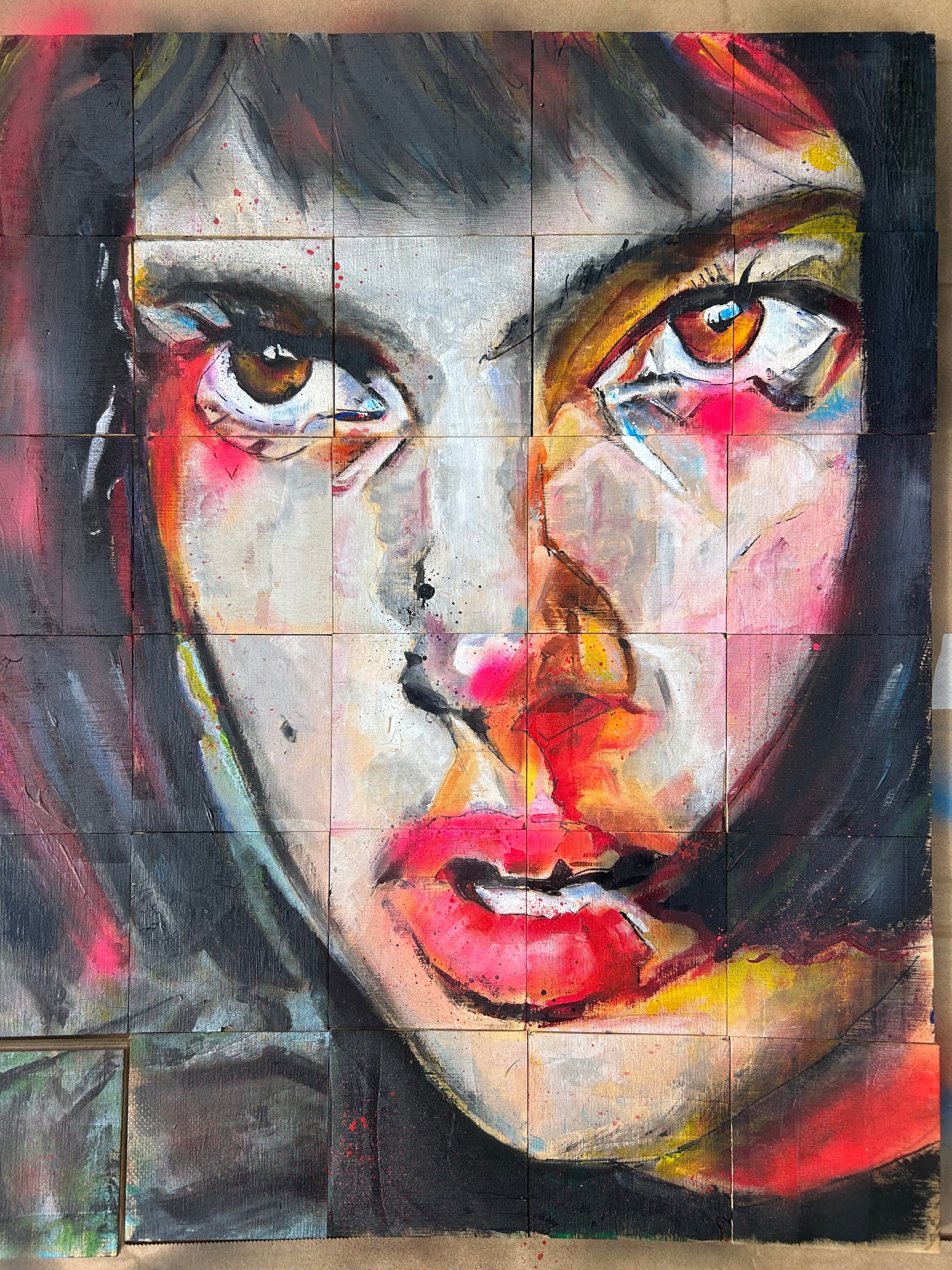 Acrylic and Spray paint on Wood block mounted in hand made wooden frame.